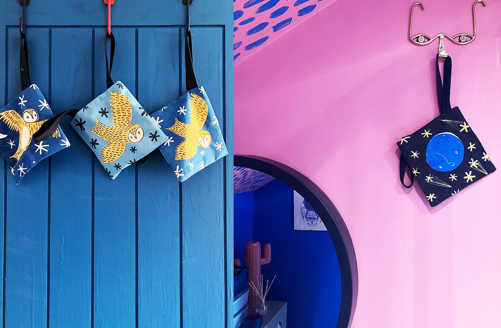 Hand screen printed and hand made wash bags, risograph art work complete the space.